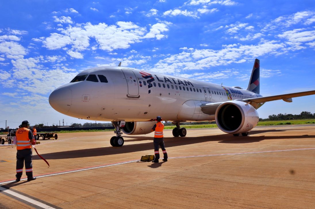 Jato da Latam Airline aterrissou pela primeira vez nesta quinta-feira em Dourados e retornará ao Aeroporto Regional Francisco de Matos Pereira nesta sexta-feira t